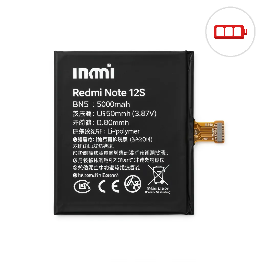 The Redmi Note 12S features a 5,000mAh battery (BN5F) with 33W fast charging. Replacing a degraded battery restores your Note 12S to full all-day performance.